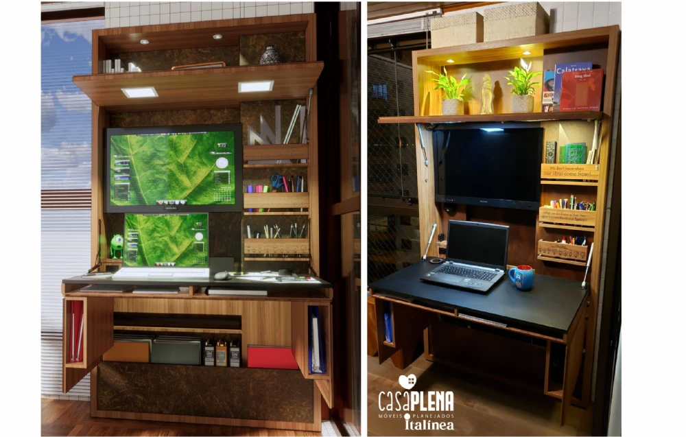 Um móvel "transformer" que, de uma bela estante, se expande para criar um confortável home office, com espaço de sobra para armazenar seu notebook, pastas, material de escritório e muito mais.