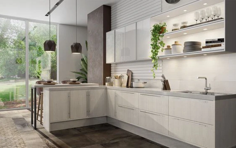 Incluir uma bancada no projeto também é uma ótima forma de otimizar o espaço de trabalho. Ela facilita a preparação de alimentos, além de virar uma área de socialização enquanto você prepara a refeição.