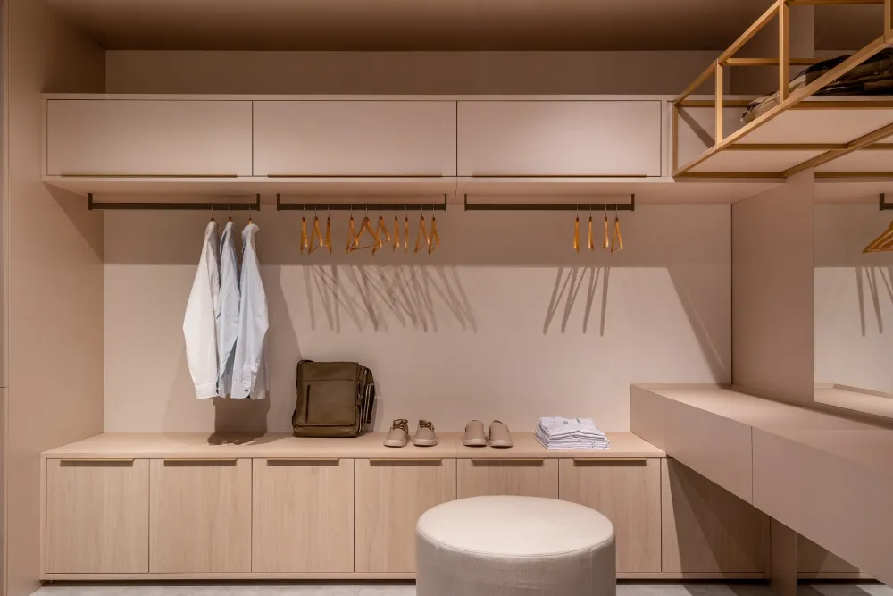 Utilize prateleiras: elas são uma maneira eficaz de usar o espaço vertical. Considere adicionar prateleiras acima da área do cabide para guardar itens como malas, chapéus ou roupas dobradas. Cestas ou caixas nas prateleiras podem ajudar a manter os itens organizados e de fácil acesso.