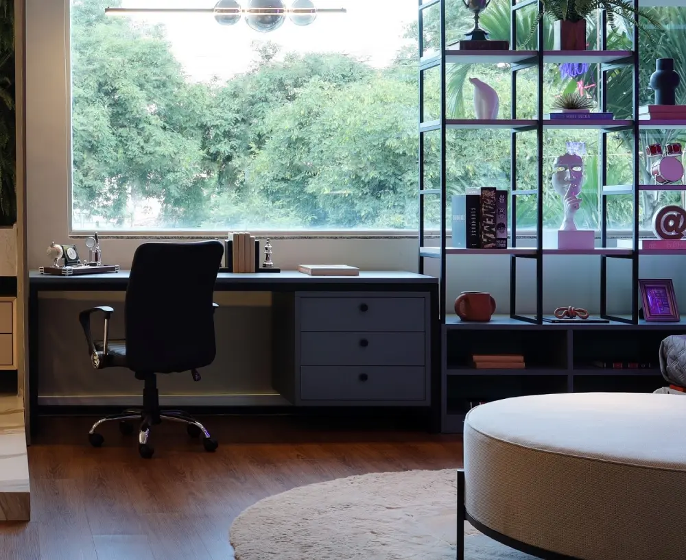 Estantes: podem ser o destaque do seu escritório, além de fornecer amplo espaço de armazenamento, deixam o ambiente mais organizado. Considere planejar estantes com prateleiras ajustáveis, assim você poderá adaptá-las às suas necessidades de organização e exibição.