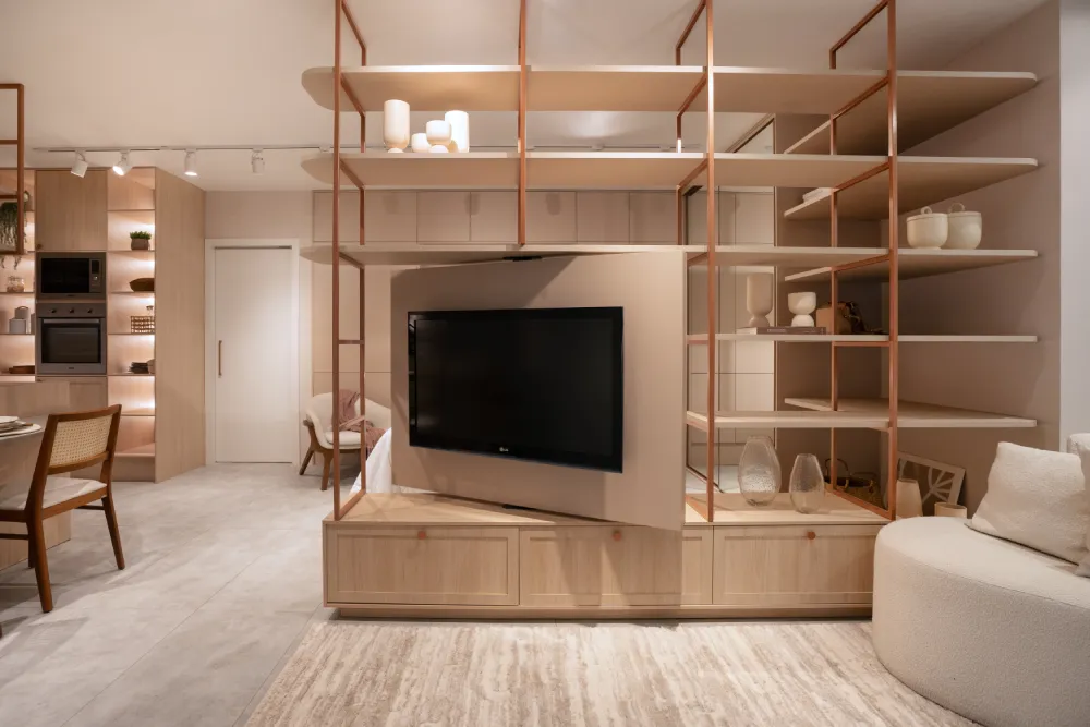 Por exemplo, estantes sob medida podem servir como divisórias, separando a área de estar do espaço de trabalho. Camas com gavetas embutidas e mesas dobráveis são outras soluções que ajudam a maximizar o uso do espaço, mantendo o ambiente organizado e funcional.